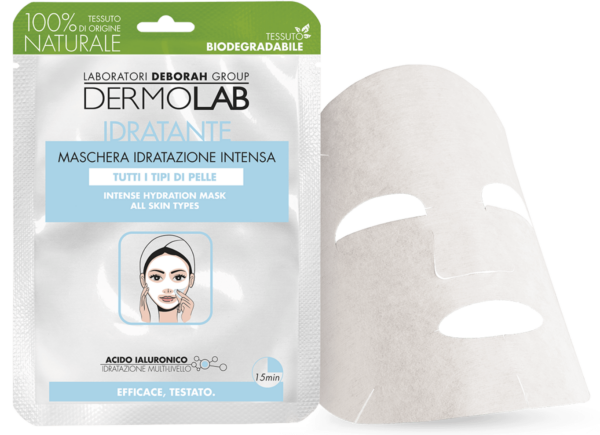 Maschera in tessuto biodegradabile, 100% di origine naturale, imbibita con un siero idratante, per una pelle liscia e morbida.
